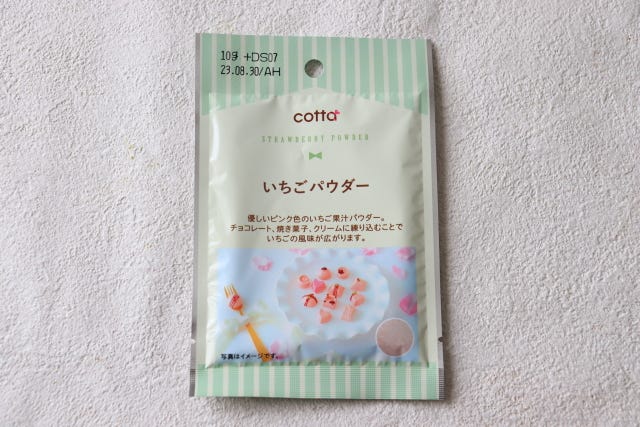今回はダイソーで見つけたいちごパウダーを使用します。ほんのりピンク色に仕上がりますが、やや薄いので、少量の食紅も入れて調整します。
