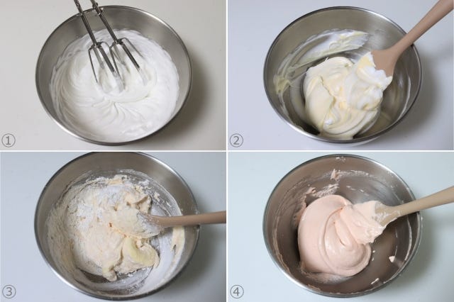 ④ 気泡を潰さないように、ゴムベラでサックリと混ぜる。お好みで水で溶いた食紅をほんの少量加えて色味を調整する。