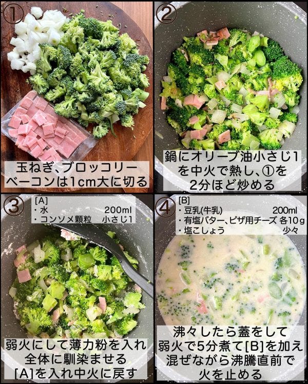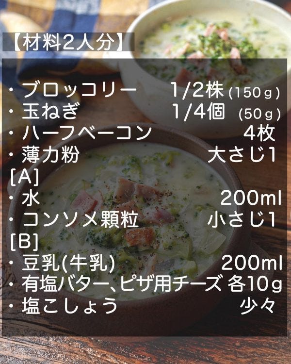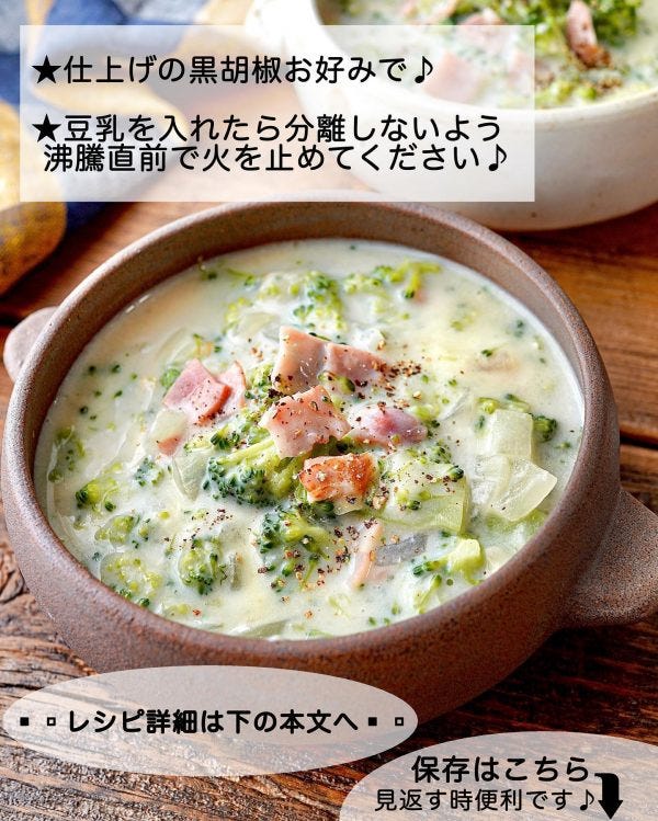 くたっと煮たブロッコリーとベーコンの塩味がとっても美味しい、クリームベースの簡単スープです。