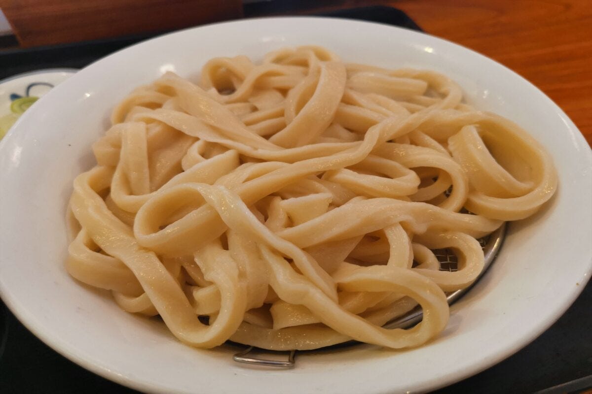 麺はかなりの太麺で、食べ応えがありそう。他の武蔵野うどん店と比べると、やや太めな印象だ。