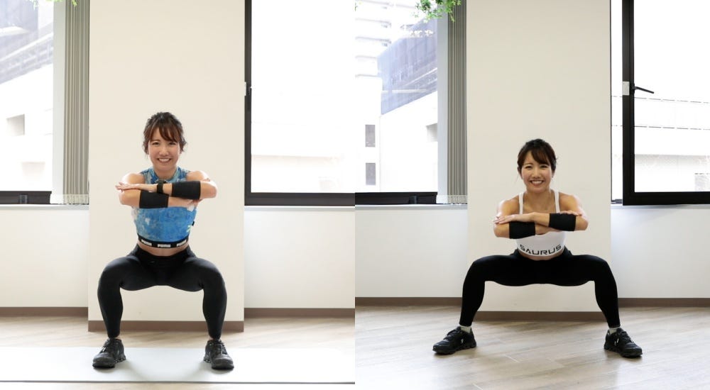 足幅を広げた「ワイドスクワット」は、通常のスクワットより内もも(内転筋)に多く刺激が加わります。また、股関節の柔軟性も高めることができます。