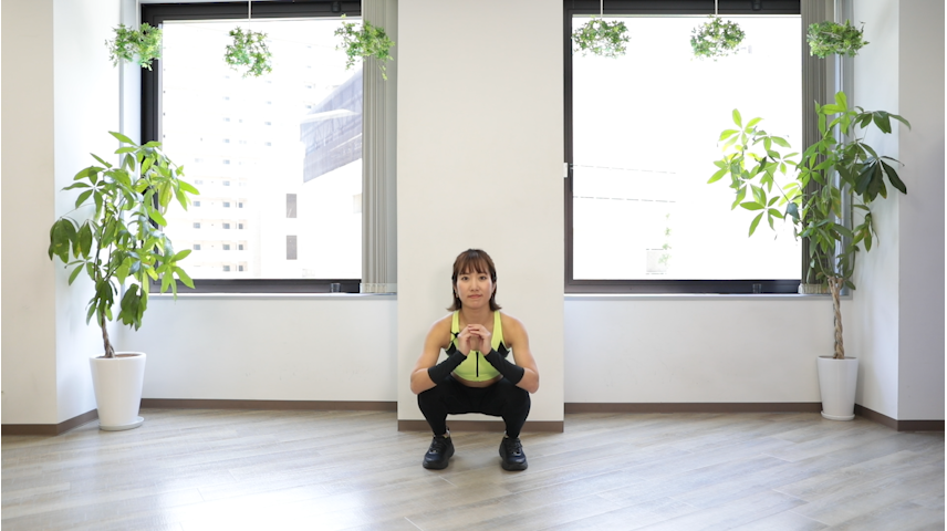 足を肩幅に開き、つま先と膝をやや外側に開く 背筋を伸ばし、足裏をしっかり床につけたまま、股関節から折り曲げるように腰を下ろす 太ももが床と平行になるまで下ろし、ゆっくりと元の姿勢に戻る