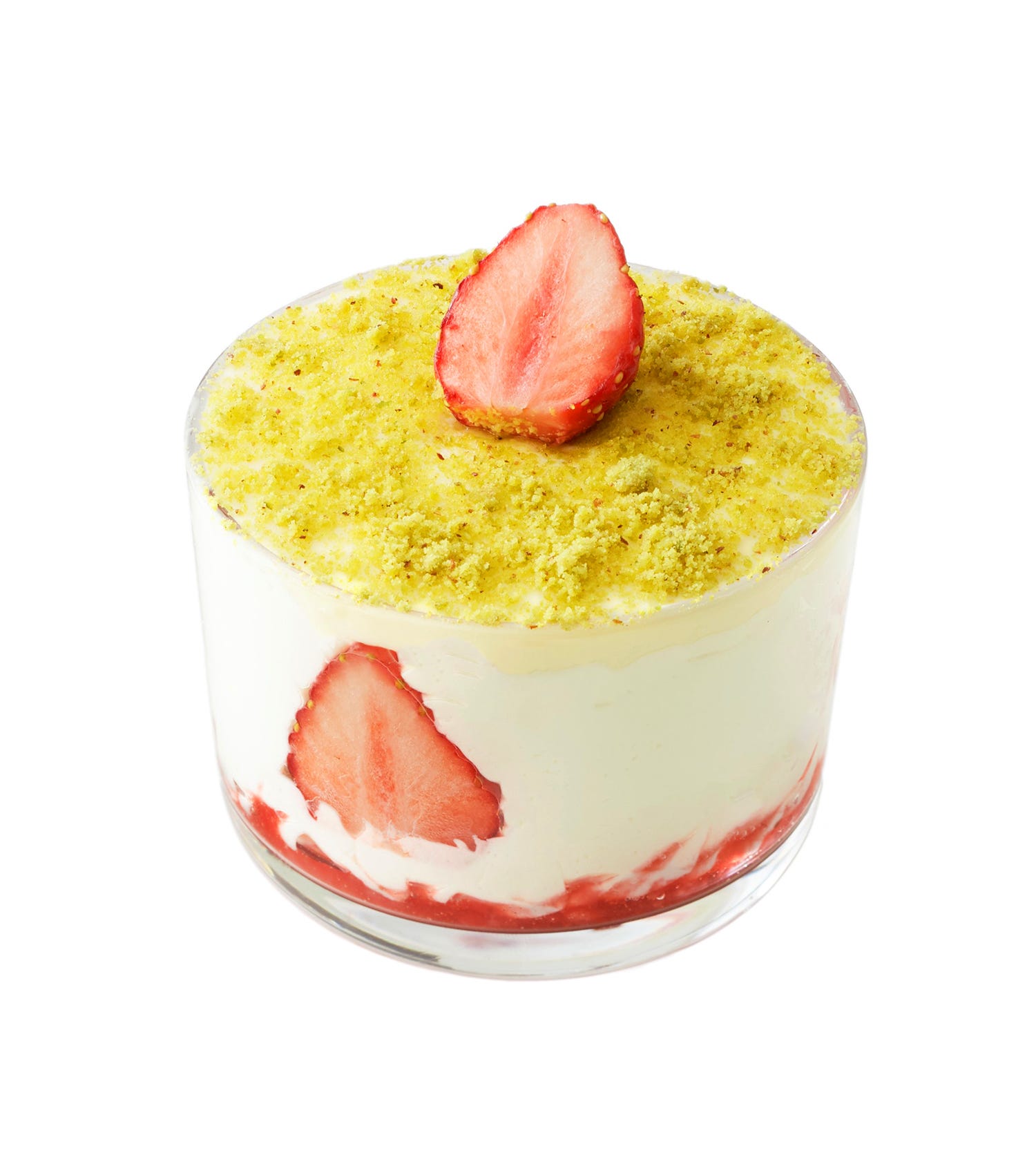 たっぷりのチーズクリームソースと生クリーム、甘酸っぱいストロベリーソースにシフォンケーキやフレッシュないちごまで入ったパフェ。トッピングのピスタチオパウダーがアクセント!