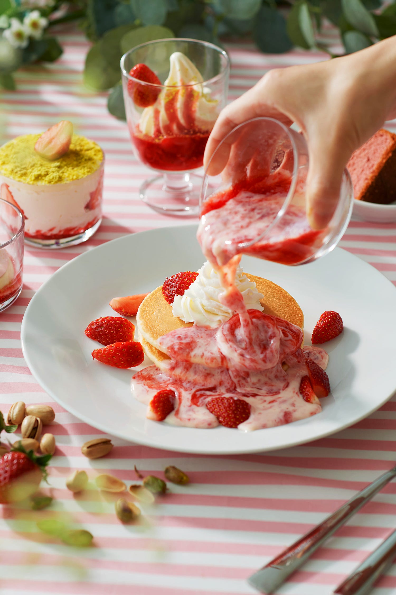 かけて楽しい!いちごみるくパンケーキは、自身でガラスに入った、果肉いっぱいないちごみるく味のソースをパンケーキにたっぷりかけて楽しめる一品。