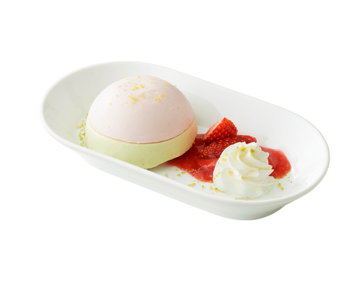 いちごとピスタチオの柔らかいムース。甘酸っぱいストロベリーソースと一緒にどうぞ。