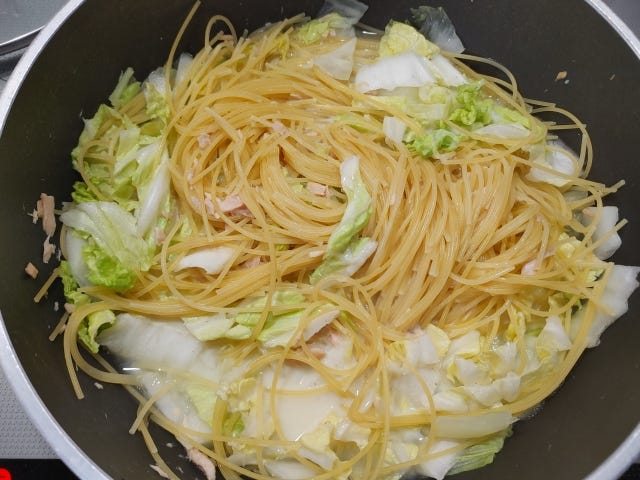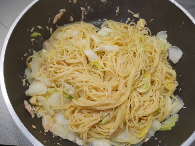 ※パスタ同士がくっついたり、フライパンにこびりついたりするのでよく混ぜてください。