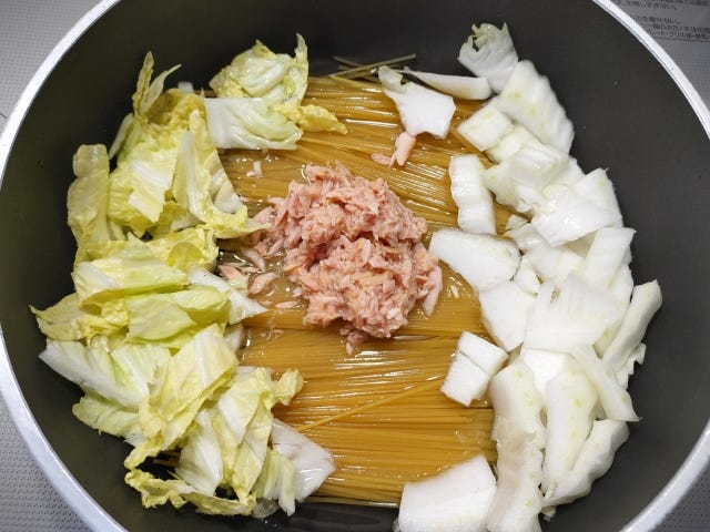 ② フライパンに半分に折った蒟蒻効果・ツナ缶・白菜・水・塩を入れ、蓋をして中火にかける。