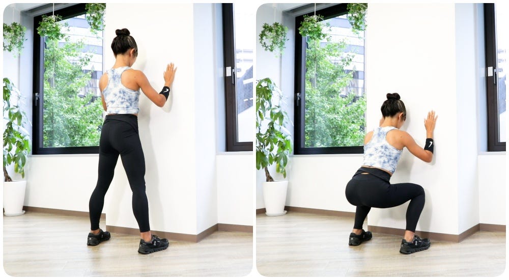 壁スクワットで感覚を掴む壁を正面にし、スクワットを行います。強制的に膝を前に出せないので、感覚を掴みやすいでしょう。
