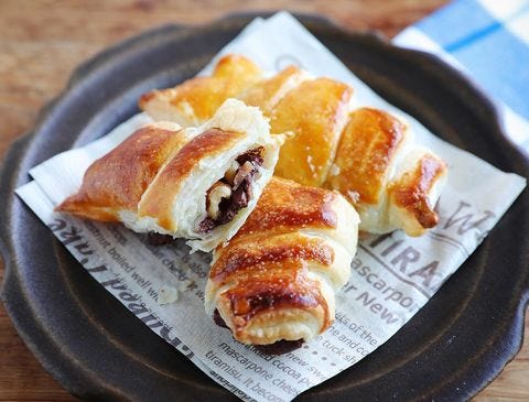 伸ばしたパイシートに板チョコやナッツを入れてクルクルっと巻くだけなので、簡単に調理できておすすめ。