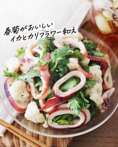 お花見のお弁当にイカとカリフラワーと春菊和え