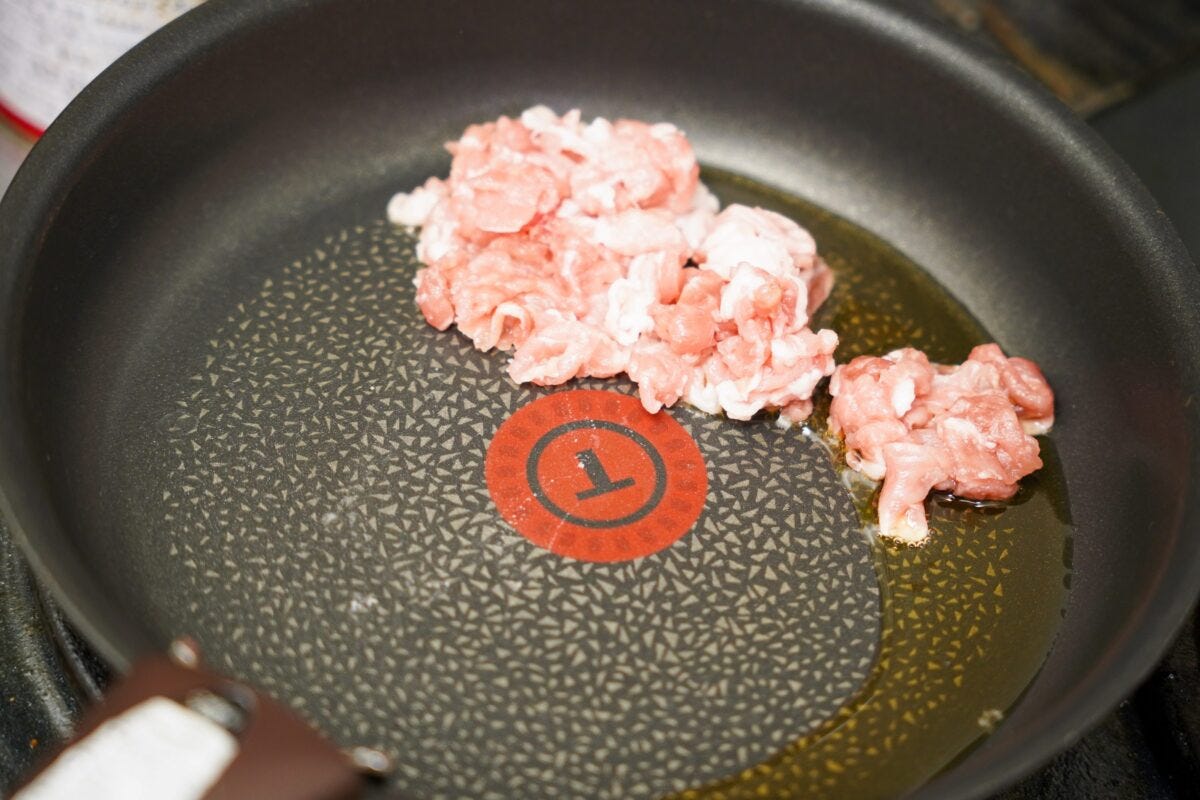 まず、多めにごま油をひき、そこに細かくカットした豚バラ肉(50g)を投入。フライパンを傾け油に浸しつつ豚バラを加熱していき、火が通ったら豚バラを端に寄せ、油に生姜(3g)を入れて香りを出していく。