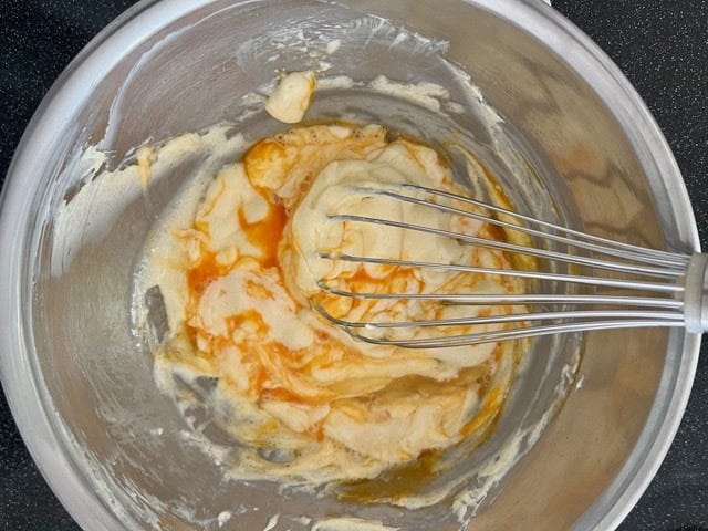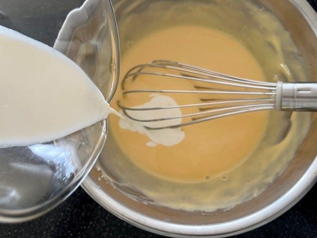 卵を1個ずつ加え、その都度、泡立て器で滑らかになるまでよく混ぜます。