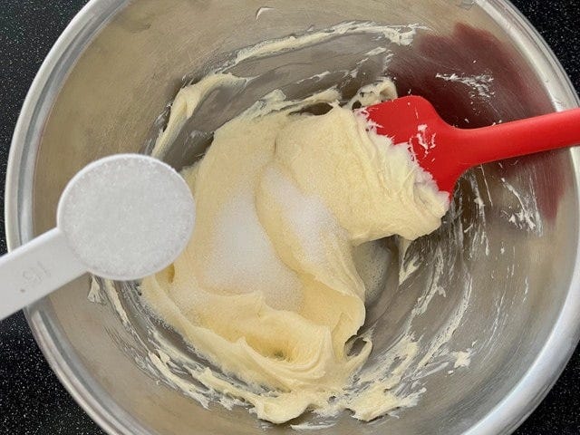 グラニュー糖を大さじ2ずつ2回加え、その都度、滑らかになるまでよく混ぜます。