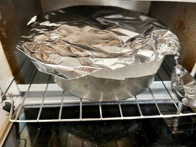 焦げ目が付いたらアルミホイルを全体にかけ、1000wで約25分焼きます。