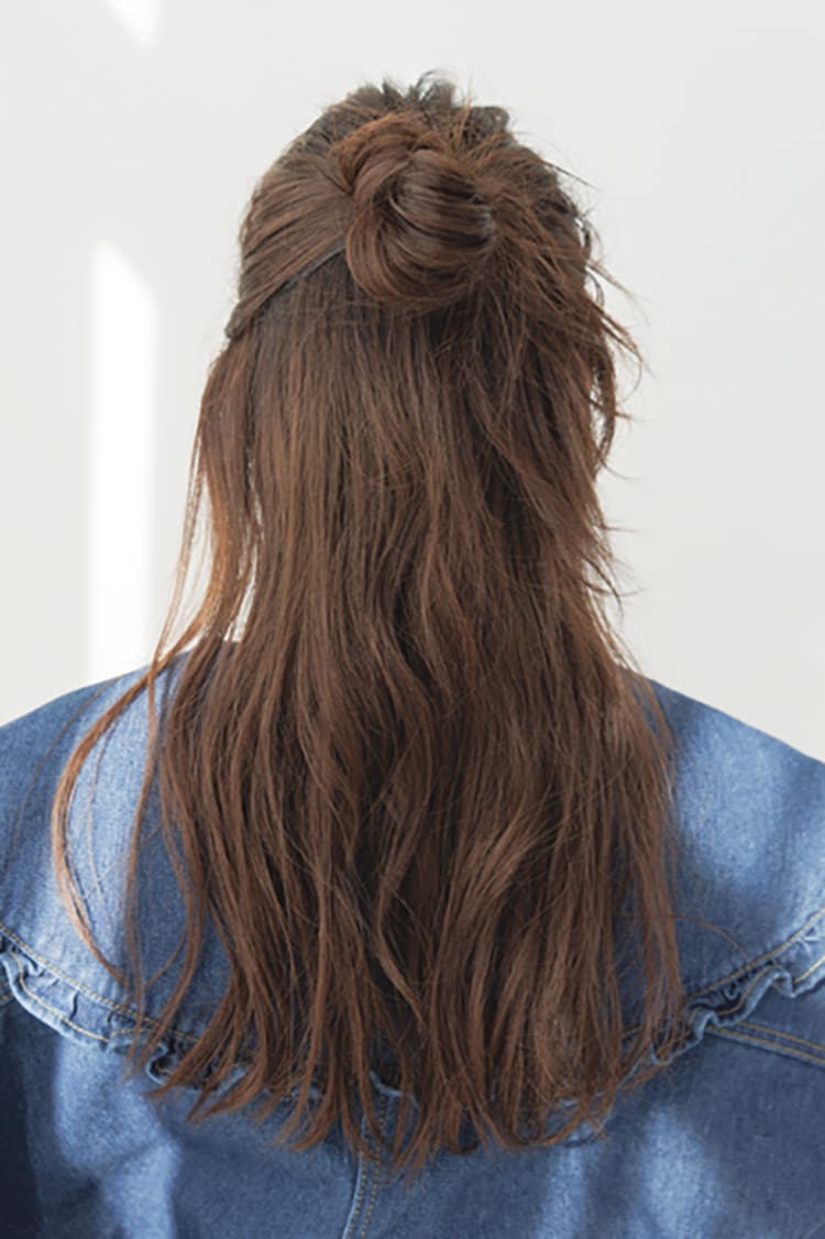 耳より上の髪をとり後頭部でハーフアップにする。結ぶとき、最後は毛先までゴムに通しきらず、わっかだんごを作る。