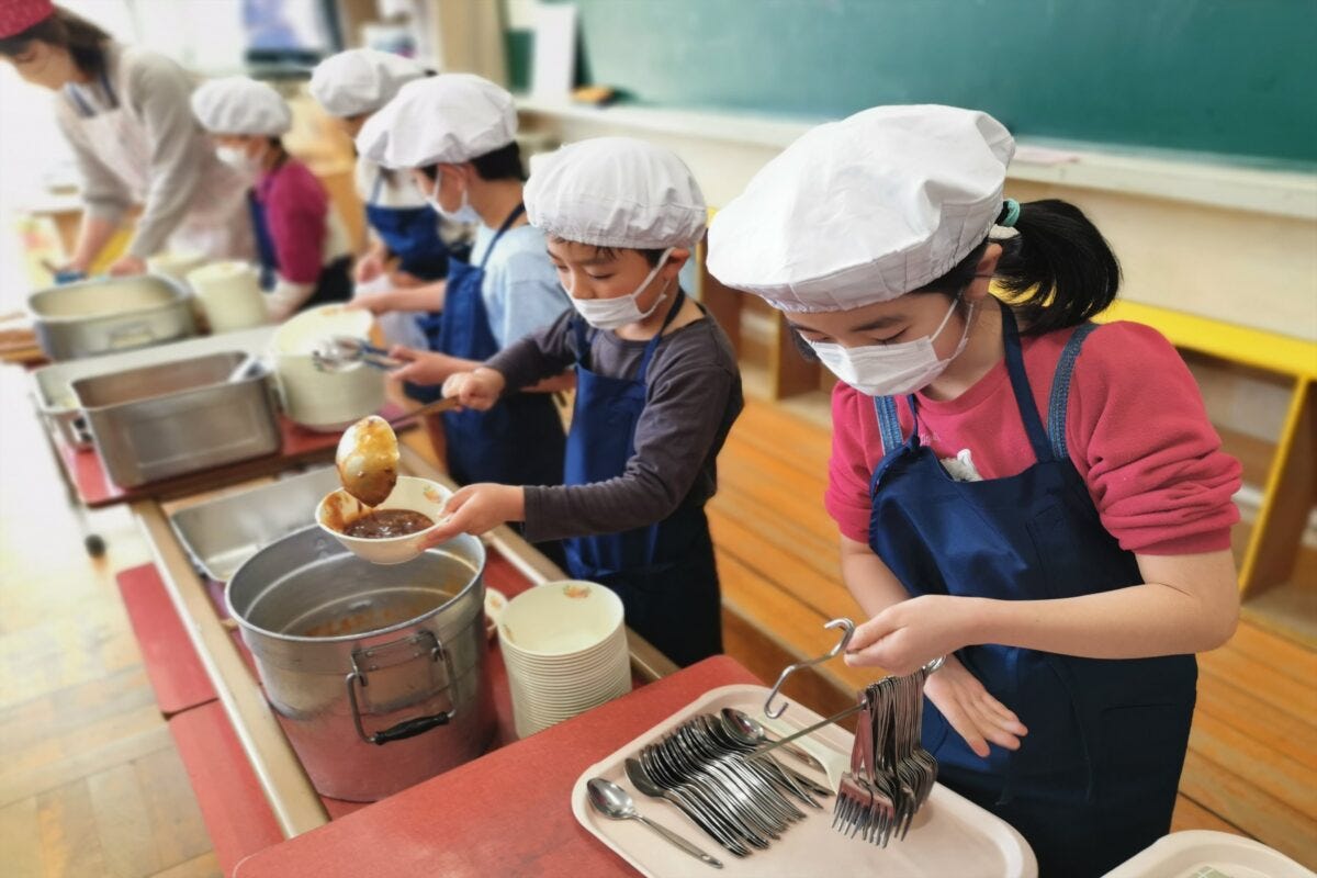 シェフや給食担当の方たちが一生懸命作った給食を、最後に盛り付ける児童たち。ミシュランシェフの料理をよそうその姿は真剣そのものである。
