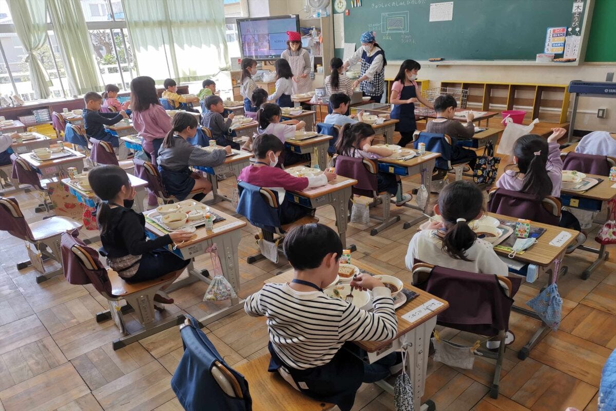 鳥羽シェフが作り上げた給食を児童たちに振舞う