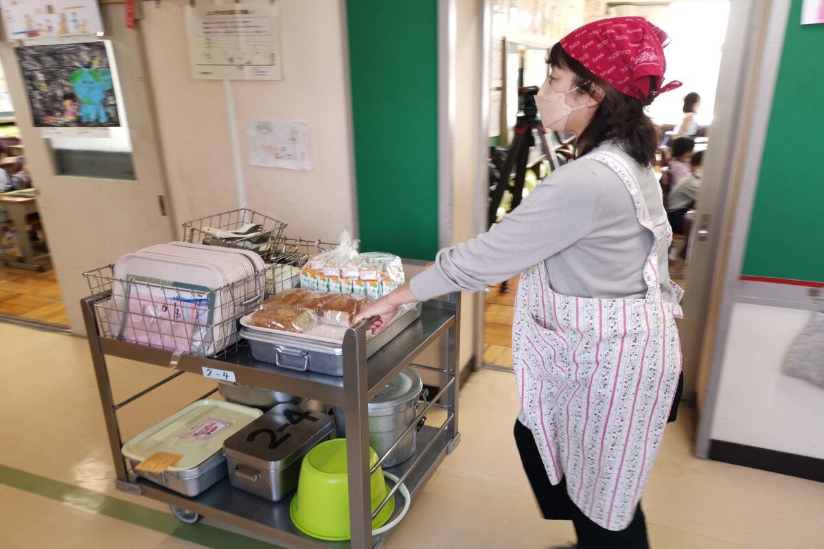 お目当ての給食が届くと、児童たちはシェフからプレゼントされたエプロンを身に着け、率先して配膳を行っていた。