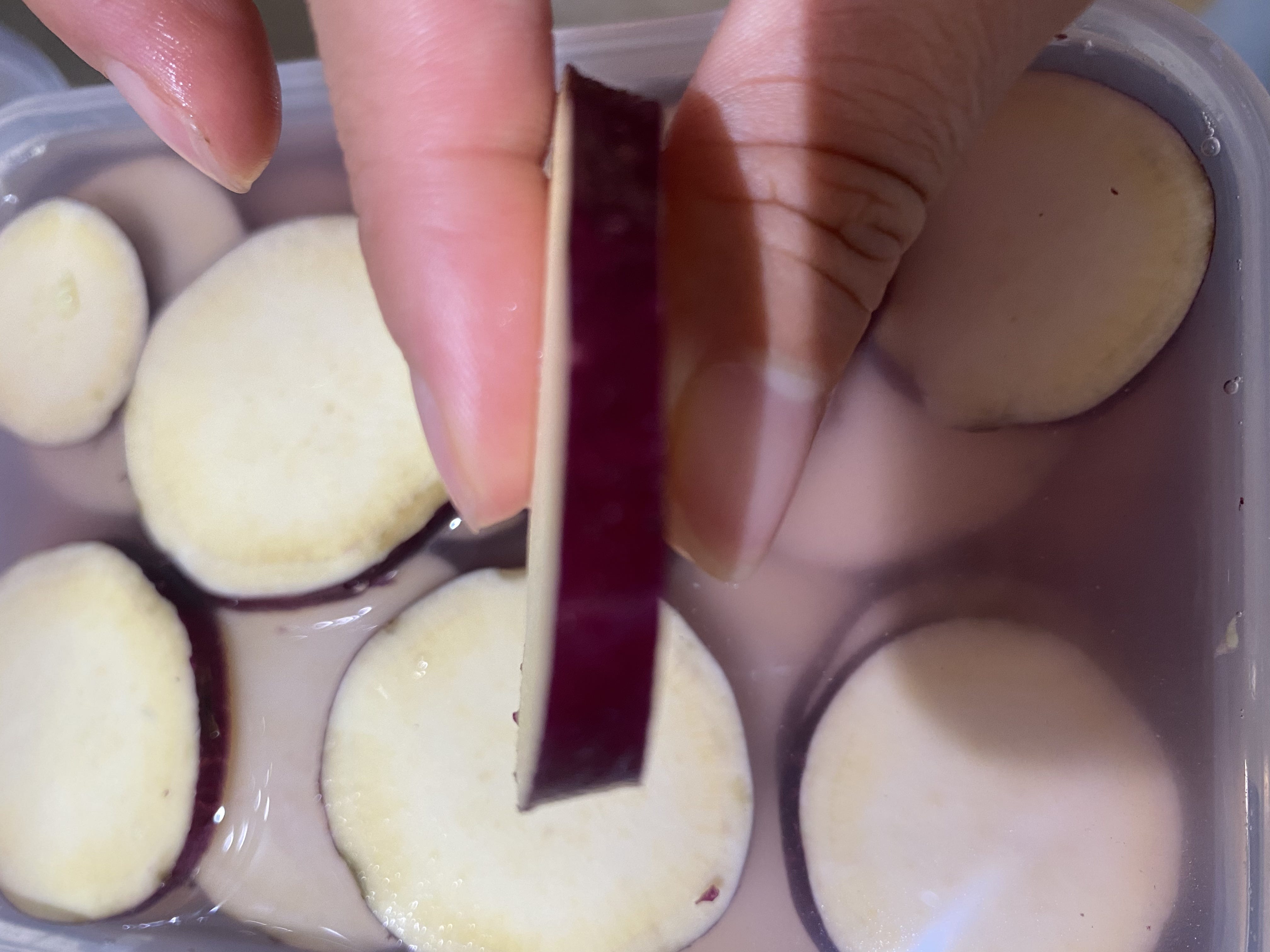 ・さつまいもはよく洗い、皮を剥かずに5mm幅の輪切りにする。
