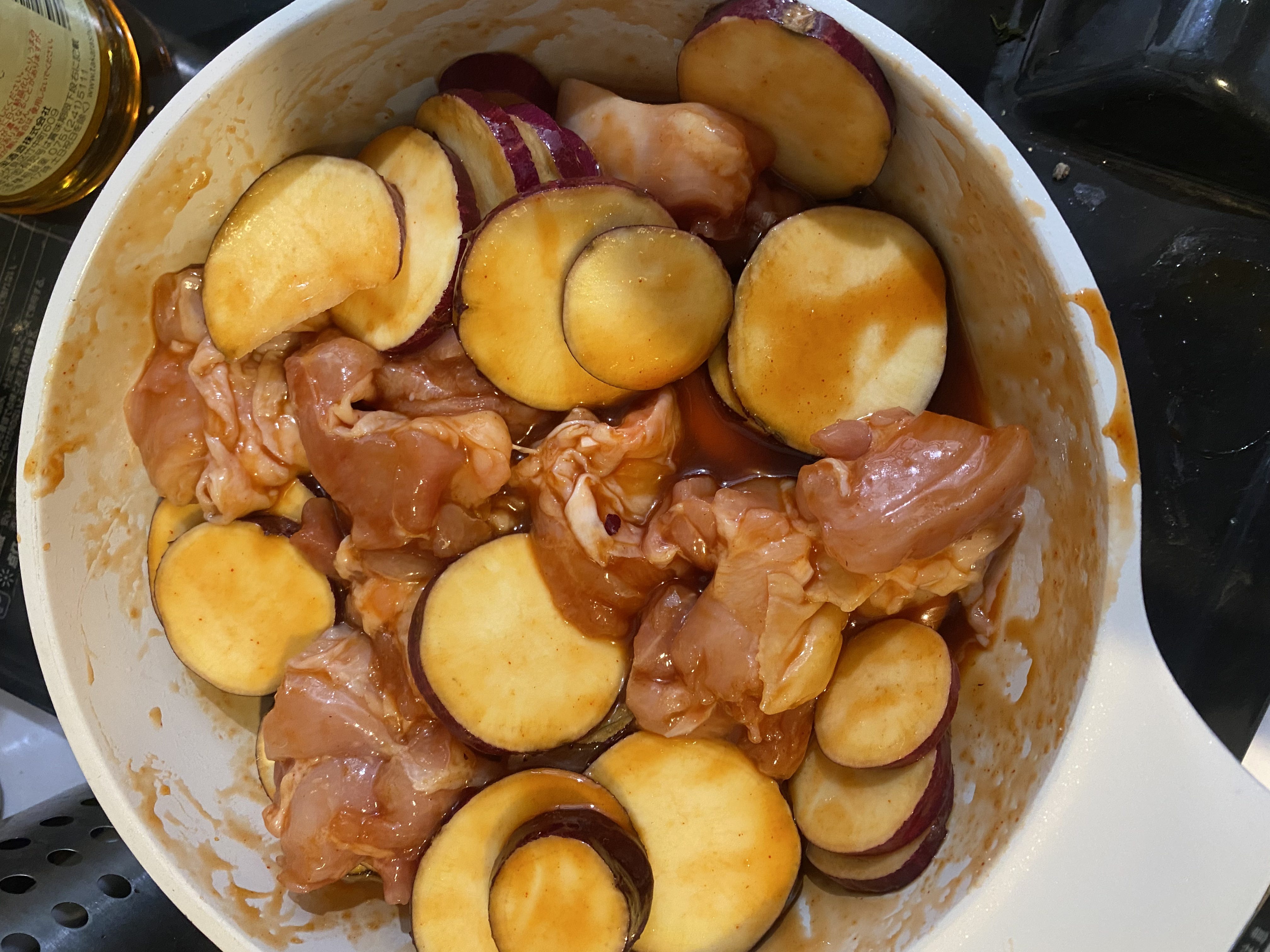 ① フライパンに(A)を入れて混ぜ、鶏もも肉、さつまいもを加えて和える。