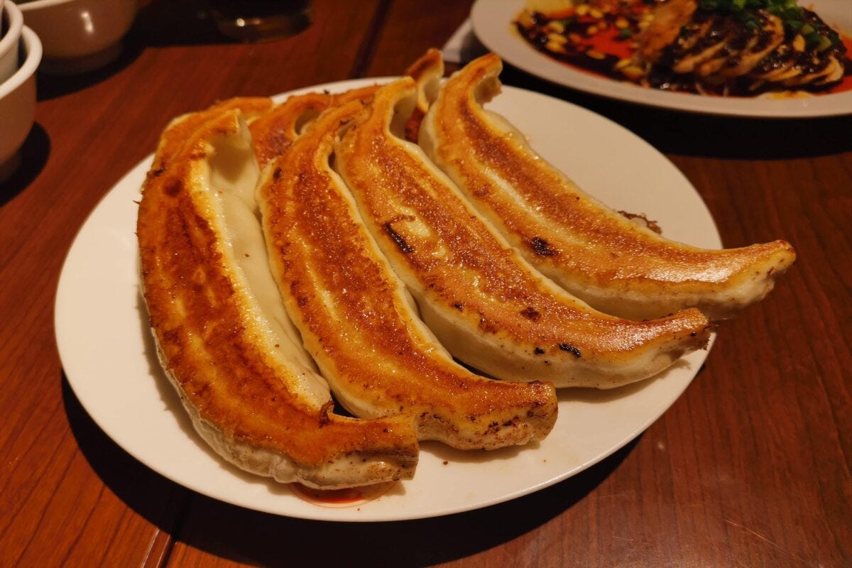 天龍の餃子はよく「バナナぐらい大きい」という人もいるが、まさにその通りで、ほぼバナナレベルの大きさ。値段は1290円とお高めだが、このサイズならむしろお得に感じるほどである。