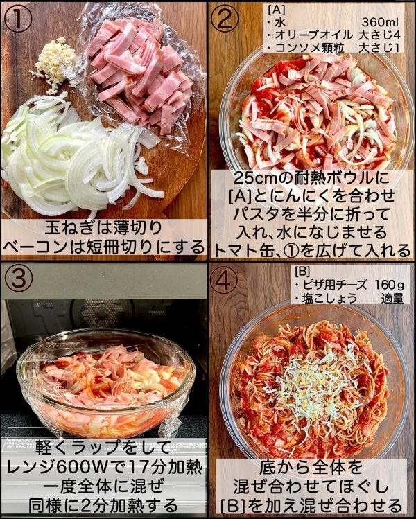 耐熱ボウルに材料をポイポイッと入れてチンするだけで、とっても簡単にお作りいただける濃厚コクうまパスタです。