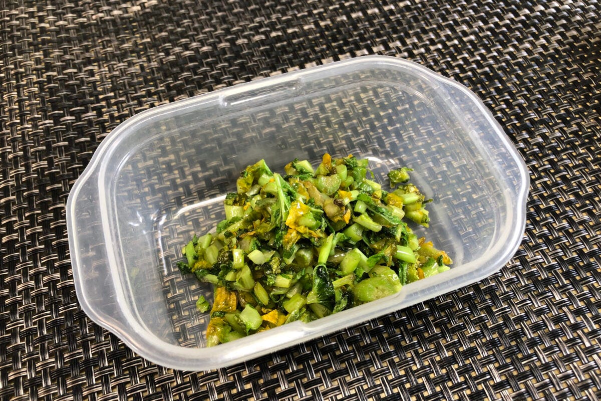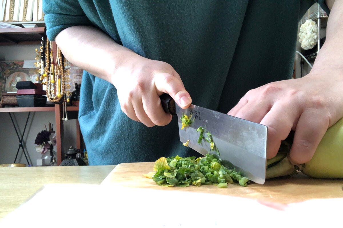 大根の葉の部分を水洗いして、5mmくらいにカットします。