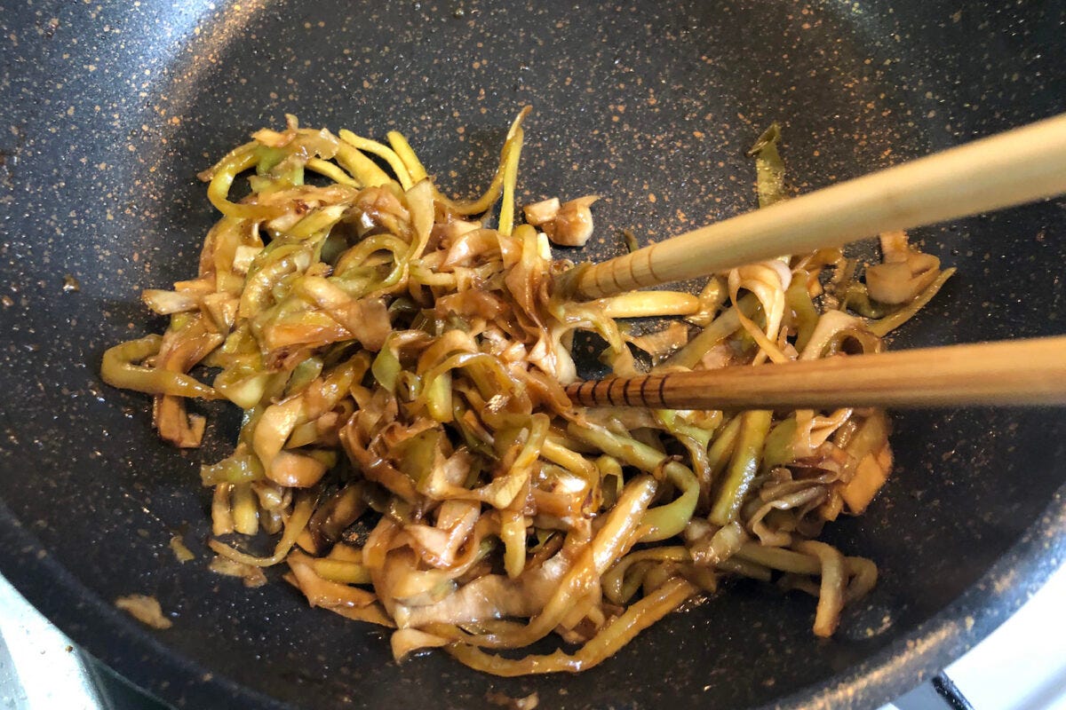大根の皮全体にたれが絡まり、たれの汁気がなくなるくらいまで炒めたら完成です。