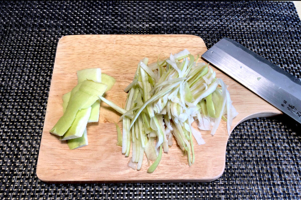 大根の皮を5、6センチの長さに切り、千切りにします。割と細かめの千切りの方が、きんぴらだれが絡んでご飯のお供向きです。