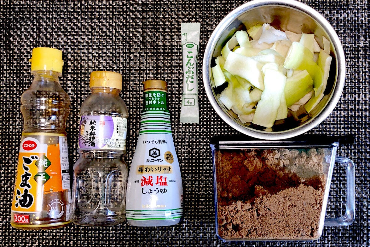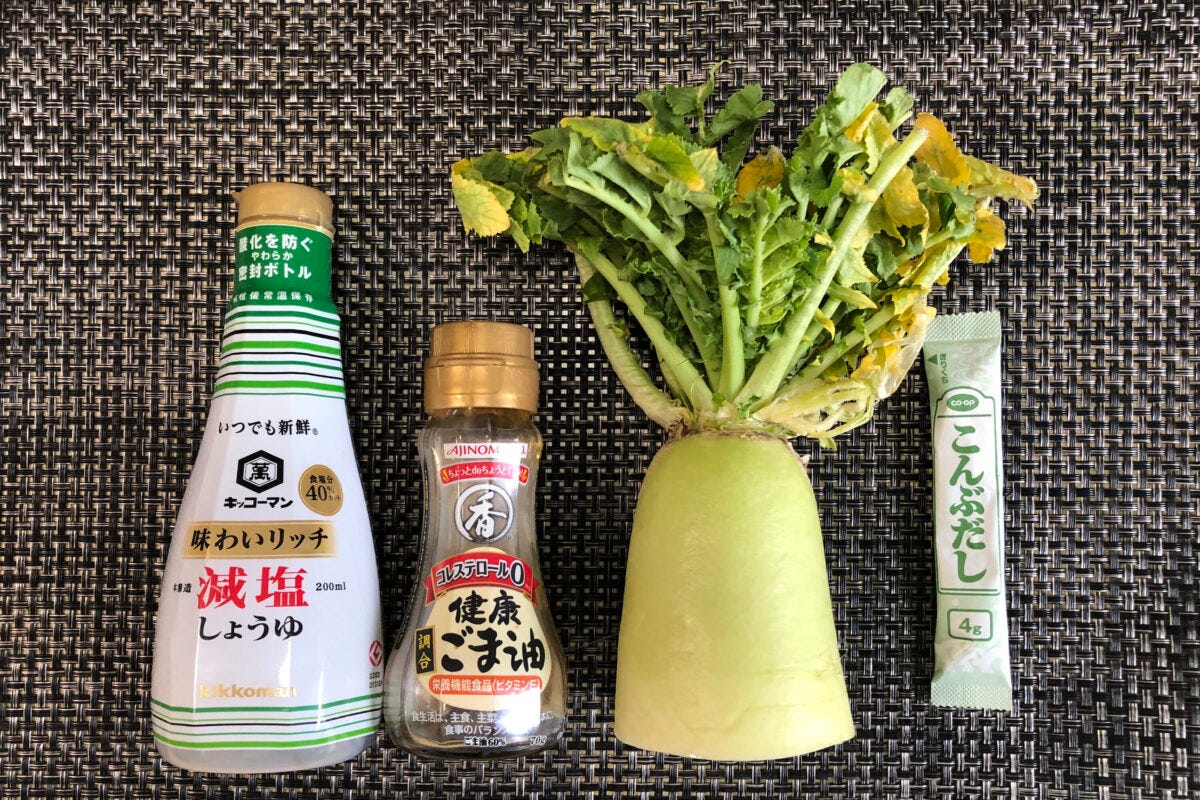 材料は、写真の大根の葉に対する大体の目安です。葉っぱの量と味付けの好みに合わせて調整してください。