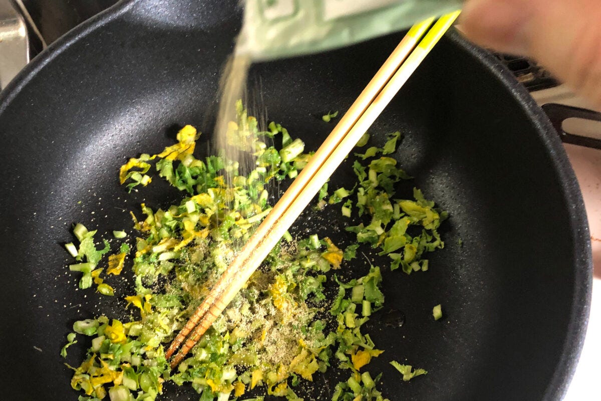 今回は、ふりかけということもあり、水っぽくなるのを避けるため、顆粒タイプのだしを使います。