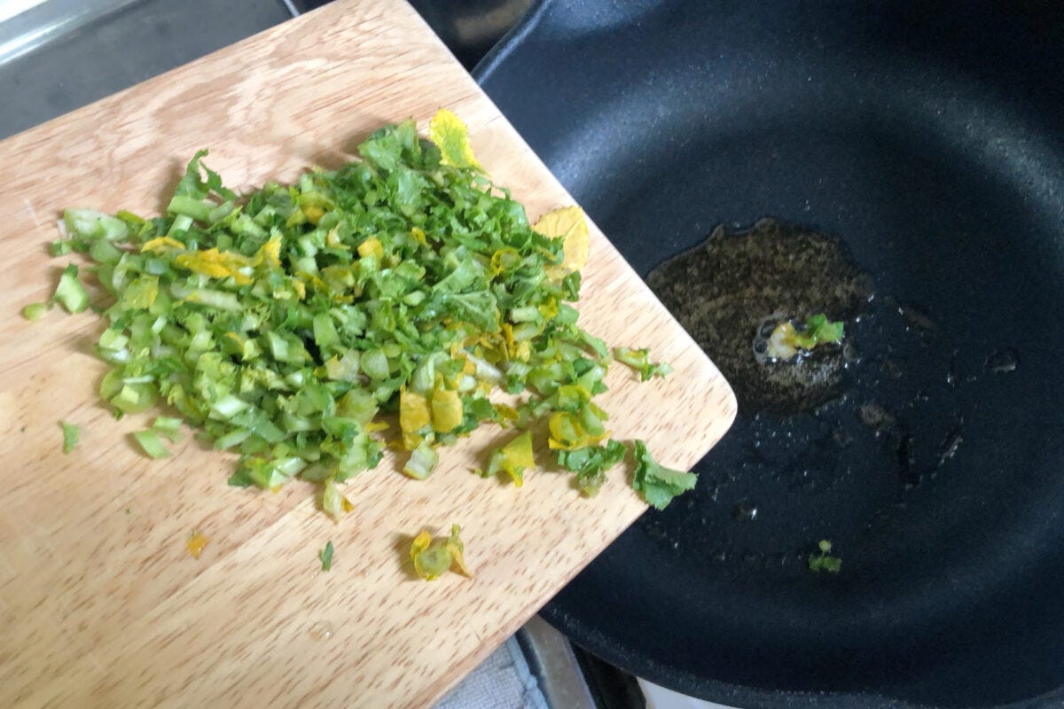 フライパンにごま油を入れ、大根の葉を炒めます。