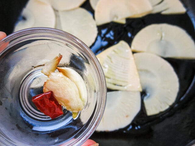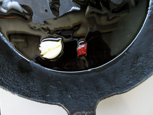 ④ にんにくのいい香りがしてきたら、にんにく、唐辛子は取り出しておきましょう。