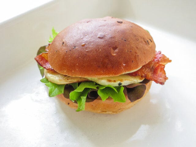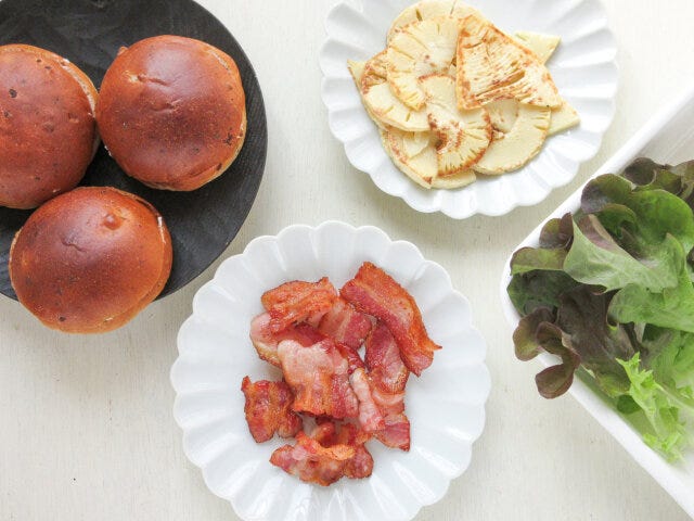 これにニンニクと唐辛子の香りをプラスすれば、今度はガツンとパンチがアップ!カリカリベーコンとあわせて、たけのこバーガーに仕上げました。たけのこは味の含みがいいので、冷めても美味しいのが嬉しいポイント。繊維を断つように薄くスライスしてソテーしたたけのこを重ねてはさみます。