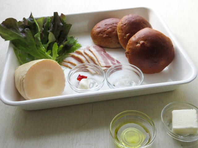 ⑦ パンにレタス、たけのこ、カリカリベーコンをサンドしてできあがり!