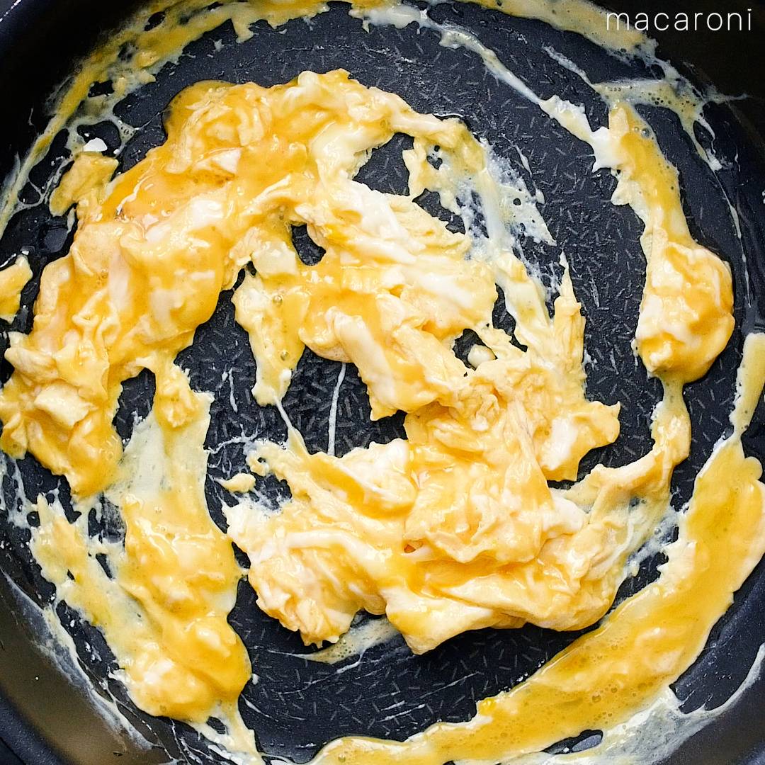 フライパンにサラダ油(大さじ1杯)を引いて強火に熱し、卵液を流し入れます。大きくかき混ぜ、半熟になったら一度取り出します。