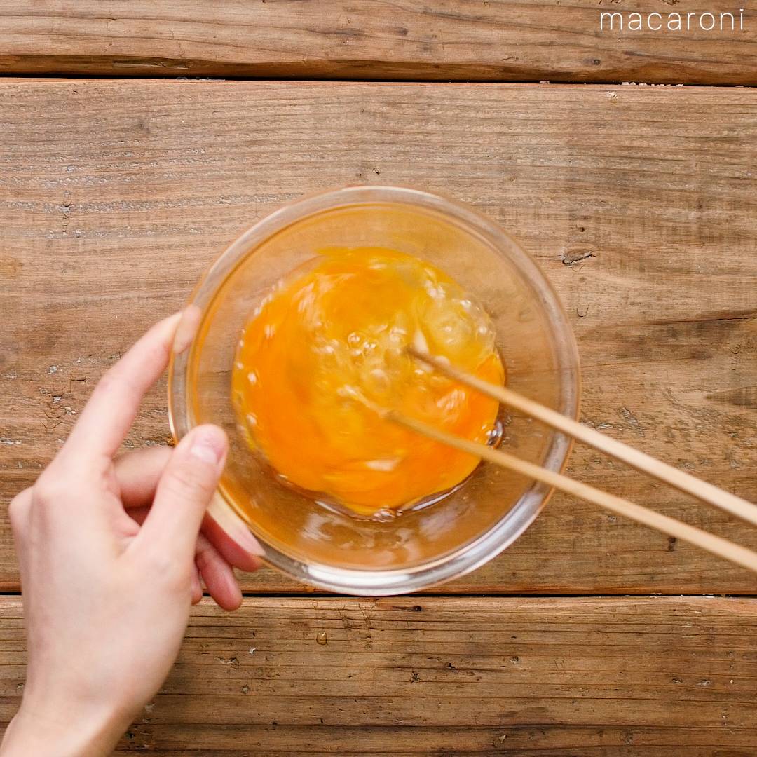 ボウルに卵を溶きほぐし、塩、こしょうを加えて混ぜ合わせます。