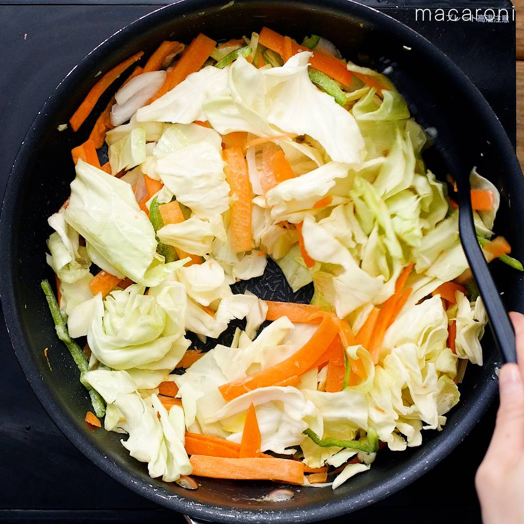 フライパンにサラダ油(大さじ1杯)を引いて熱し、カット野菜を入れて炒めます。