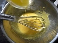 卵を卵白と卵黄に分けます。卵黄にグラニュー糖30gを加えて、白っぽくもったりするまで泡立て器で撹拌します。1000wの電子レンジ30秒でとかしたバターを加え、よく混ぜます。