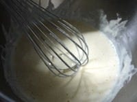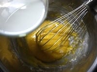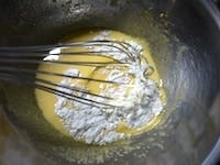 薄力粉をふるい、2回にわけて加え、そのつど、だまにならないようによく混ぜます。