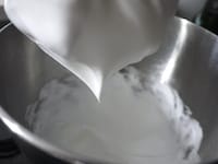 卵白にグラニュー糖40gを2~3回に分けて加え、ハンドミキサーの中速~高速で撹拌し、角がピンと立ったメレンゲを作ります。