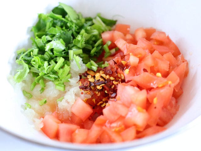 ⑥ Aを入れて和えたら、③の上にかけ、飾りのパクチーの葉を乗せて出来上がり。