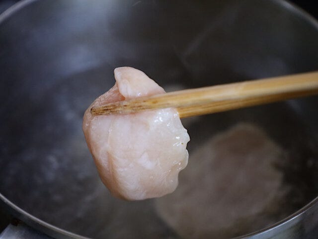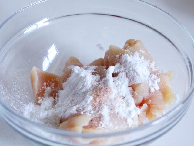 ① 鶏むね肉は、ひと口大の削ぎ切りにし、片栗粉と塩(分量外)ふたつまみほどと混ぜる。(混ぜにくい場合は、少量の酒または水を入ます。)