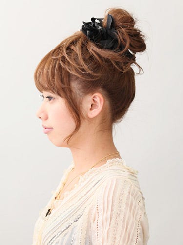 背が低いぽっちゃりさんは、トップにお団子を作るアップのヘアスタイルにすると、背を高見えさせることができます。