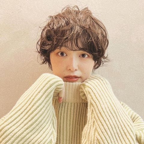 こちらは、前髪はワンカールで、表面に女性らしい柔らかなパーマをかけたヘアスタイル。くしゃっとしたくせ毛風になっています。
