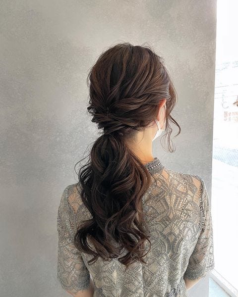 こちらはお呼ばれシーンにもおすすめの、大人女性らしいこなれ感のあるローポニーアレンジの髪型です。