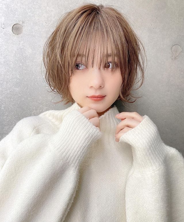 ボリュームのある前髪と短めの襟足のバランスも、この髪型のポイントです。