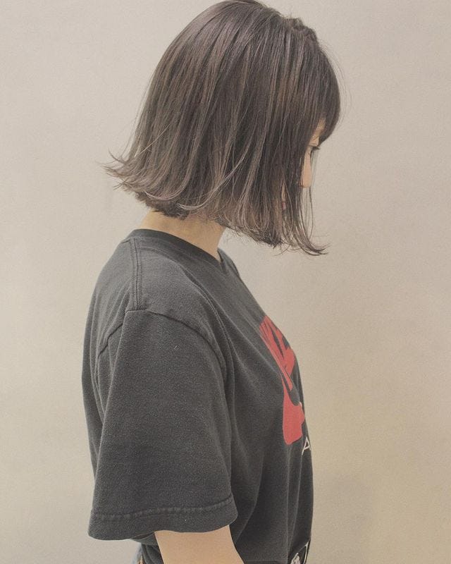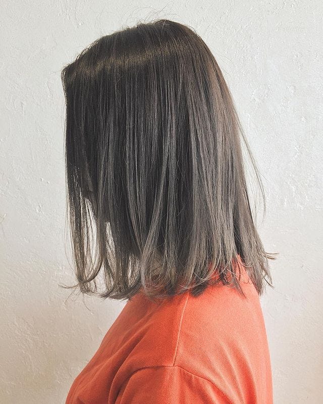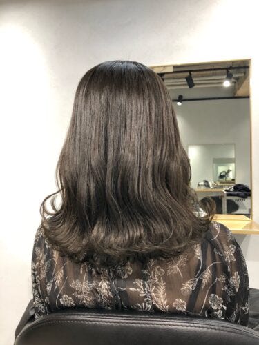 ナチュラルな黒髪のような暗めのヘアカラーも、人気色のグレーにパールを加えた色味を使えば、ツヤ感のある軽い仕上がりになります。