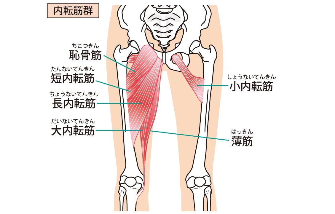 内転筋(ないてんきん)太ももの内側にある筋肉。大内転筋・長内転筋・短内転筋・薄筋・恥骨筋の5つの筋肉で構成されており、「内転筋群」と呼ばれます。