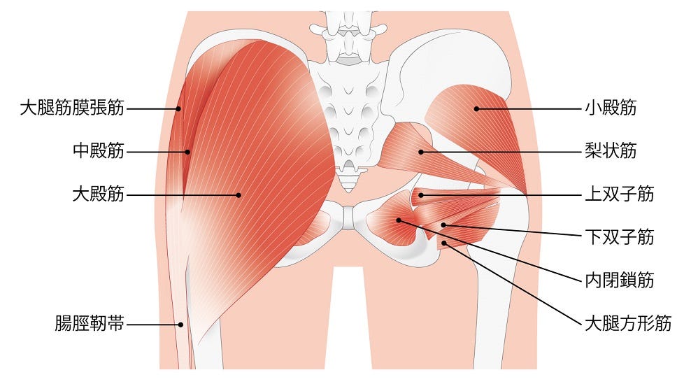 大臀筋はお尻の形を作るほか、股関節を動かして脚を後ろに上げたり、横に持ち上げるときに力を発揮します。日常生活でも、さまざまな場面で体を安定させるために力を発揮している筋肉です。